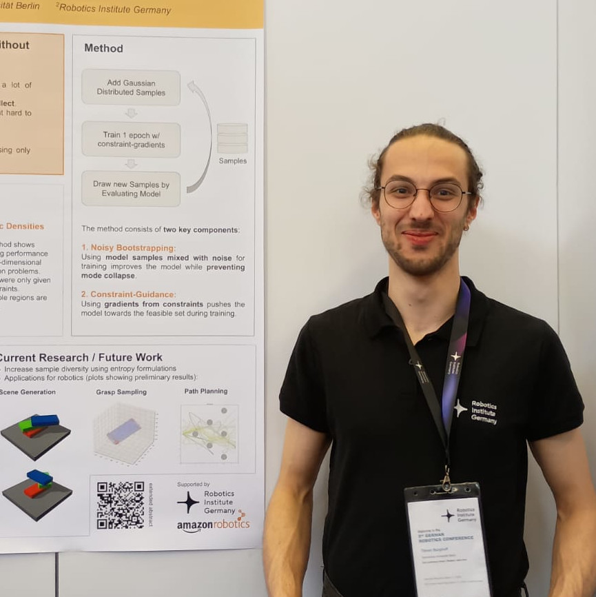 Hello! I'm Tilman, a Master's student in Computer Science at the Technische Universität Berlin. I'm interested in robotics, machine learning, optimization and discrete mathematics. I am currently working as a student research assistant at the Learning and Intelligent Systems Lab at TU Berlin. I finished my bachelor of mathematics in 2023. I wrote my thesis on topology titled "Filtrierung und Homologie von Simplizialkomplexen" under the supervision of Prof. Dr. Michael Joswig. It was recognized with an award for outstanding bachelortheses by the Berliner Mathematische Gesellschaft.